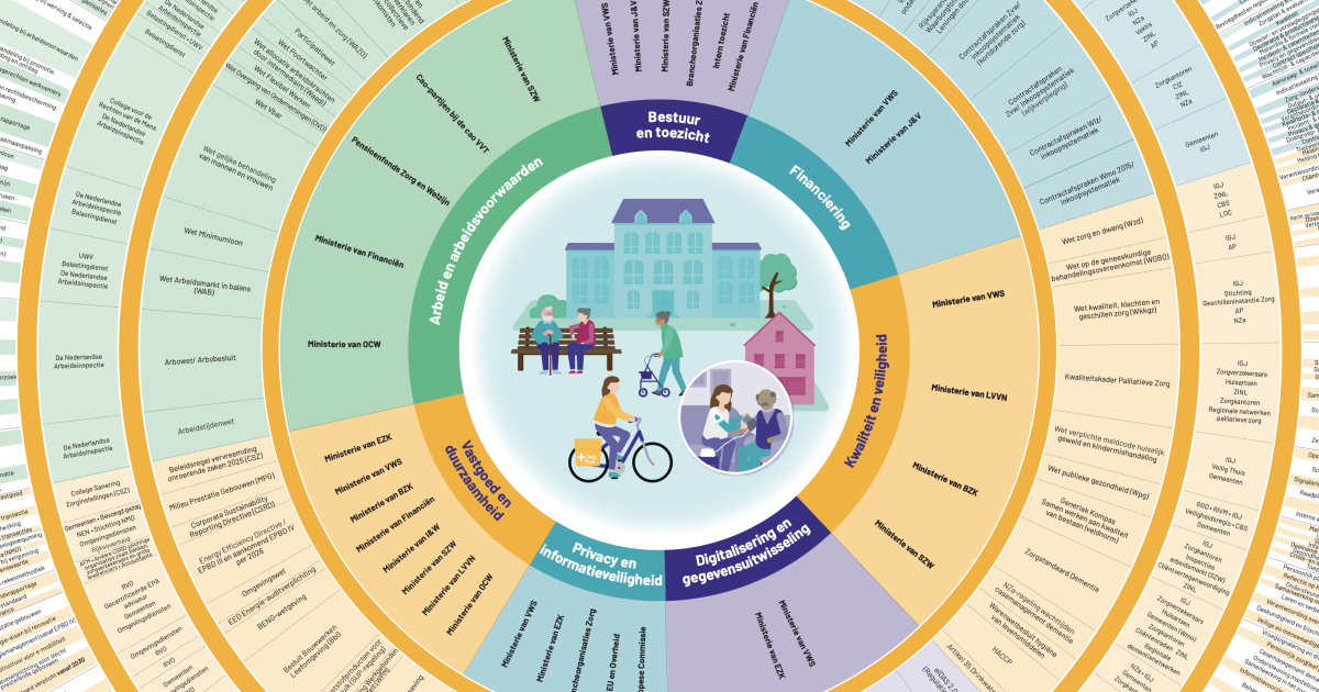 Zorgprofessionals besteden steeds meer van hun tijd aan registratie en verantwoording. Dat is geen keuze, maar het gevolg van een systeem dat steeds meer eisen stelt. De infographic 'Goed geregeld?' laat zien aan welke wet- en regelgeving een zorgorganisatie moet voldoen. Ook toont het welke bronnen van administratieve lasten dit met zich meebrengt en hoeveel partijen betrokken zijn. Zo wordt inzichtelijk hoe complex het speelveld is waarin de zorg voor ouderen georganiseerd moet worden.